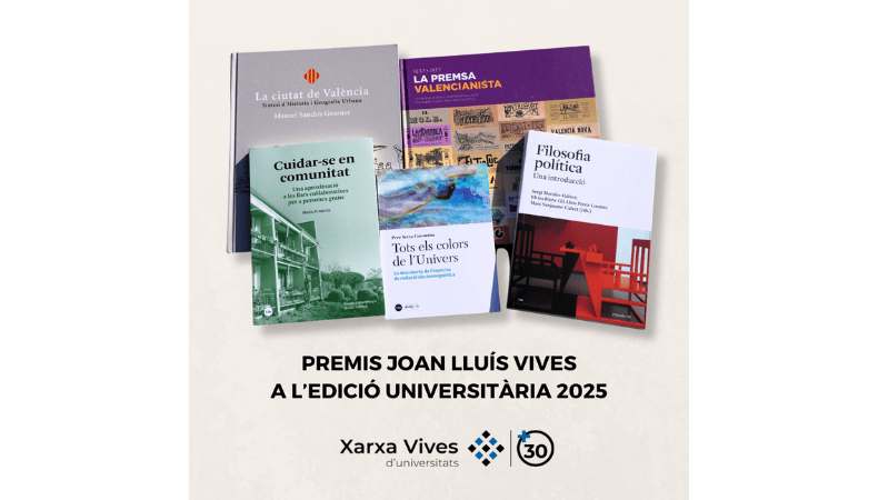 Convocats per la Xarxa Vives d’Universitats, aquests guardons premien les millors obres publicades en àmbits com la ciència, les humanitats, l’assaig o la divulgació, i contribueixen a destacar la vitalitat i el rigor de l’edició universitària. En aquest acte, es presentaran les 5 obres guanyadores de 2025: “Tots els colors de l’Univers. La descoberta de l’espectre de radiació electromagnètica”, “Cuidar-se en comunitat. Una aproximació a les llars col·laboratives per a persones grans”, “Filosofia política. Una introducció”, “La premsa valencianista 1837-1977” i “La ciutat de València. Síntesi d’Història i Geografia Urbana”.